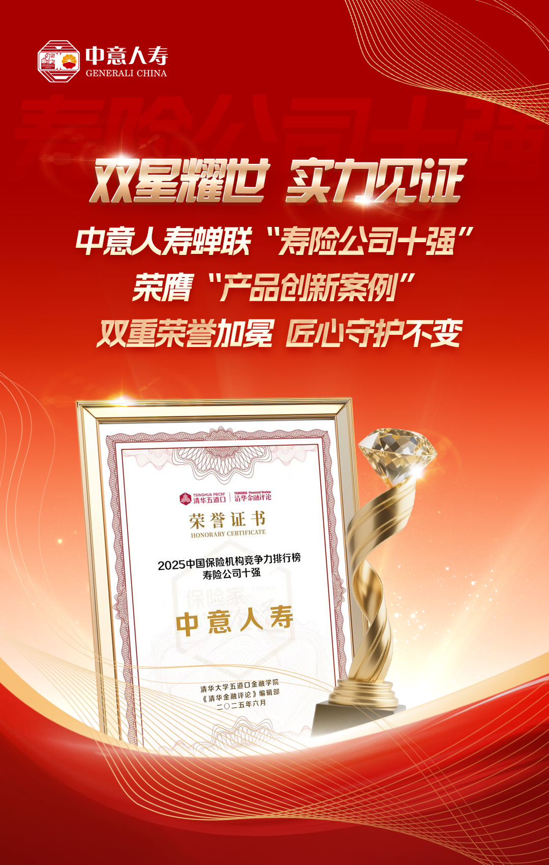近日,《清華金融評(píng)論》正式發(fā)布《2025中國(guó)保險(xiǎn)競(jìng)爭(zhēng)力研究報(bào)告》,中意人壽保險(xiǎn)有限公司(以下簡(jiǎn)稱“中意人壽”)憑借其不斷攀升的綜合實(shí)力與創(chuàng)新能力,蟬聯(lián)《中國(guó)保險(xiǎn)競(jìng)爭(zhēng)力排行榜》“壽險(xiǎn)公司十強(qiáng)”,并憑借“一生摯愛”系列產(chǎn)品,獲評(píng)“年度產(chǎn)品創(chuàng)新典型案例”。